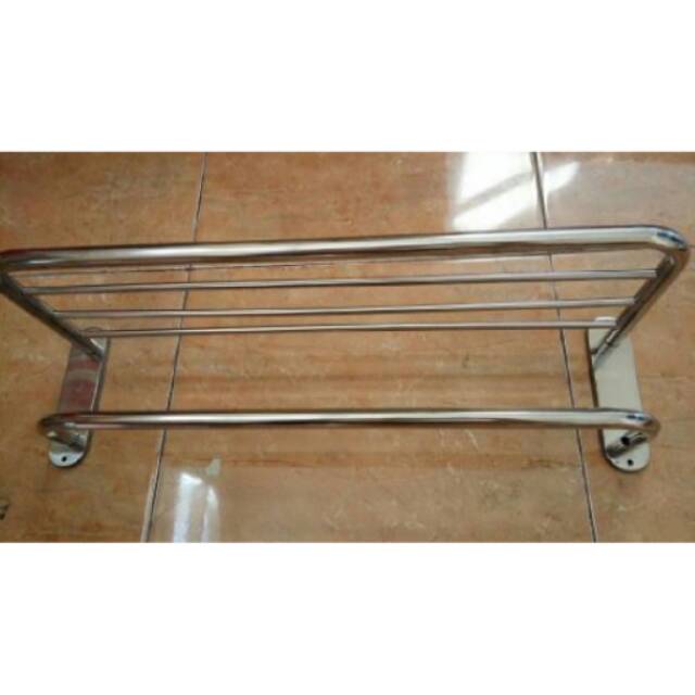 Gantungan handuk 5 baris stainless anti karat pjg 58cm. Sudah termasuk baut fiser dan penutup baut.