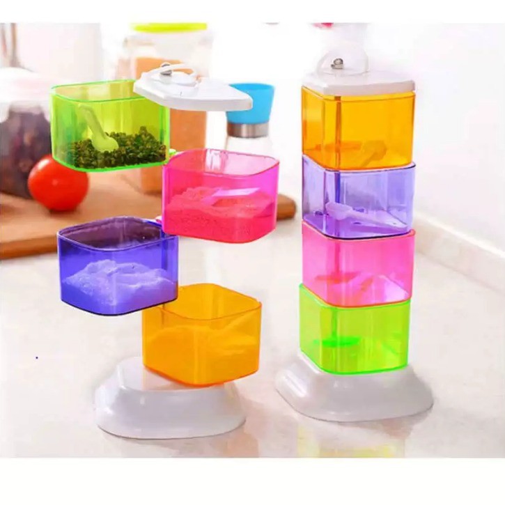 Set tempat bumbu dapur unik terdiri dari 4 susun, tiap susun bisa diputar 360 derajat memudahkan untuk mengambil bumbu dapur saat diperlukan. Masing-masing susun beda warna fungsinya agar mudah dingat. Anda dapat membedakan isi bumbu dapur per warna. Tiap susun dilengkapi sendok kecil.