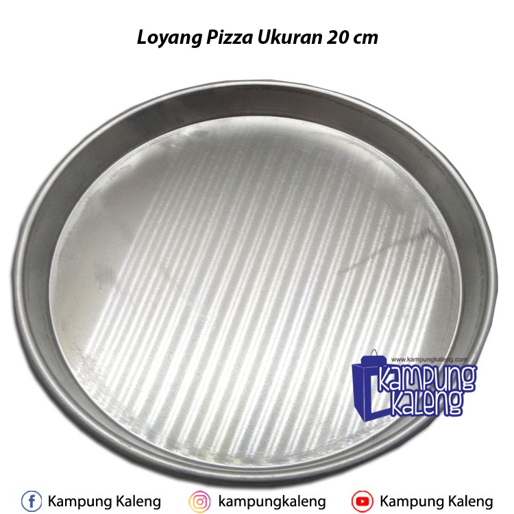 Loyang Pizza Mini Ukuran diameter atas 20 cm diameter bawah 18 cm, terbuat dari alumunium press ketebalan 0.5 mm. Minimal Pembelian 6 pcs. Harga yang tertera untuk 6pcs.