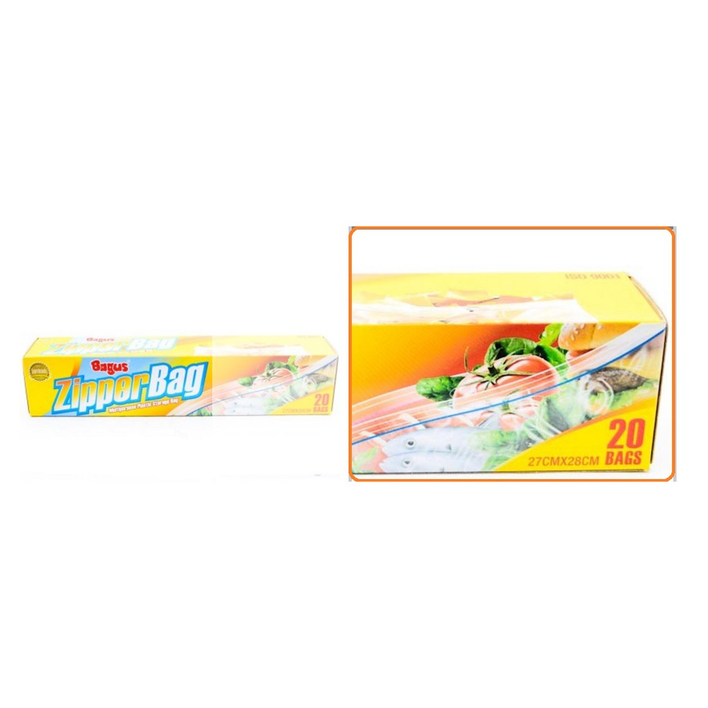 BAGUS ZIPPERBAG/ Kantong penyimpan makanan, memiliki daya lekat yang kuat sangat cocok digunakan untuk menyimpan daging/ikan mentah dalam freezer. Dapat pula digunakan untuk menyimpan sayur mayur/buah-buahan maupun makanan basah/berminyak/saos. Setiap lembar BAGUS ZIPPERBAG tercetak tanggal dan data yang dapat digunakan untuk membantu mengingatkan batas waktu pemakaian dari makanan itu sendiri ataupun keterangan lainnya.