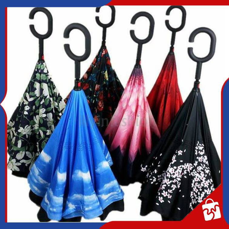 Desain payung terbalik ini memiliki kegunaan khusus, Anda tidak akan lagi terkena hujan pada saat keluar dari mobil dikarenakan cara membuka payung dengan arah terbalik.